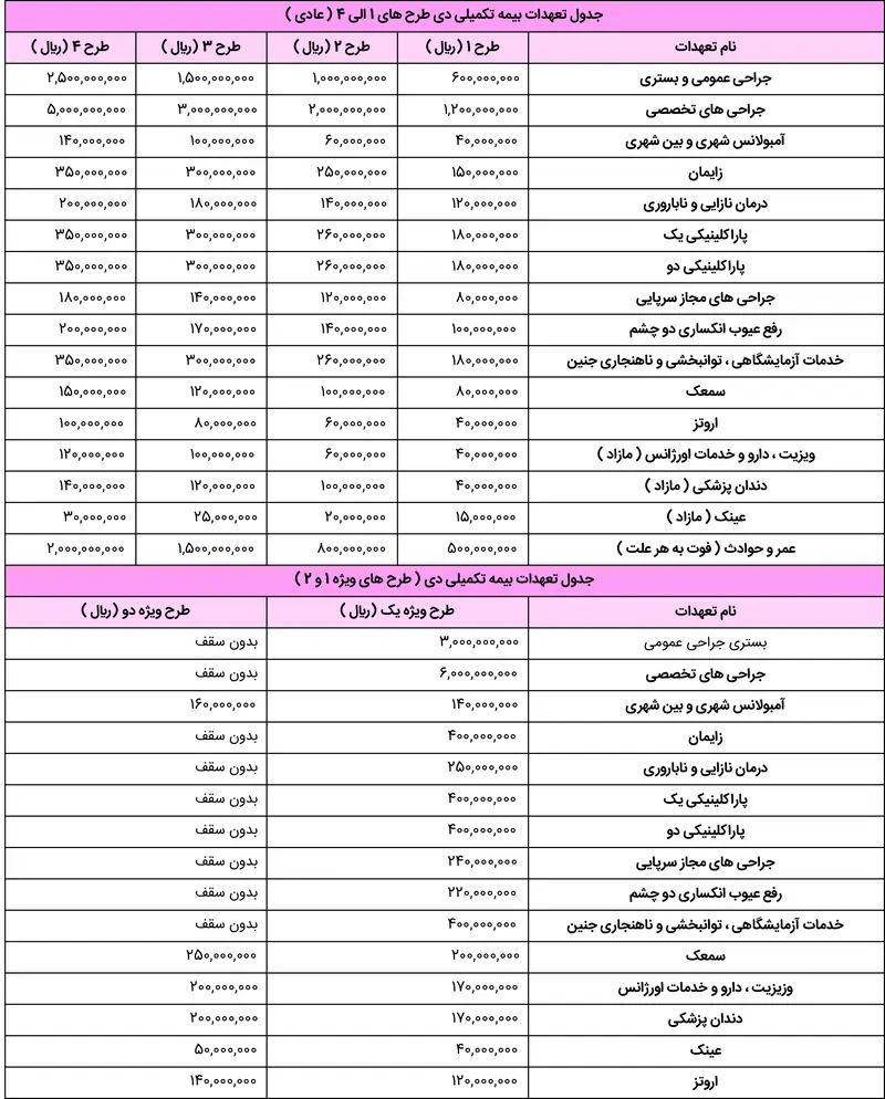 جدول تعهدات بیمه تکمیلی دی طرح‌های ۱ الی ۴ (عادی)